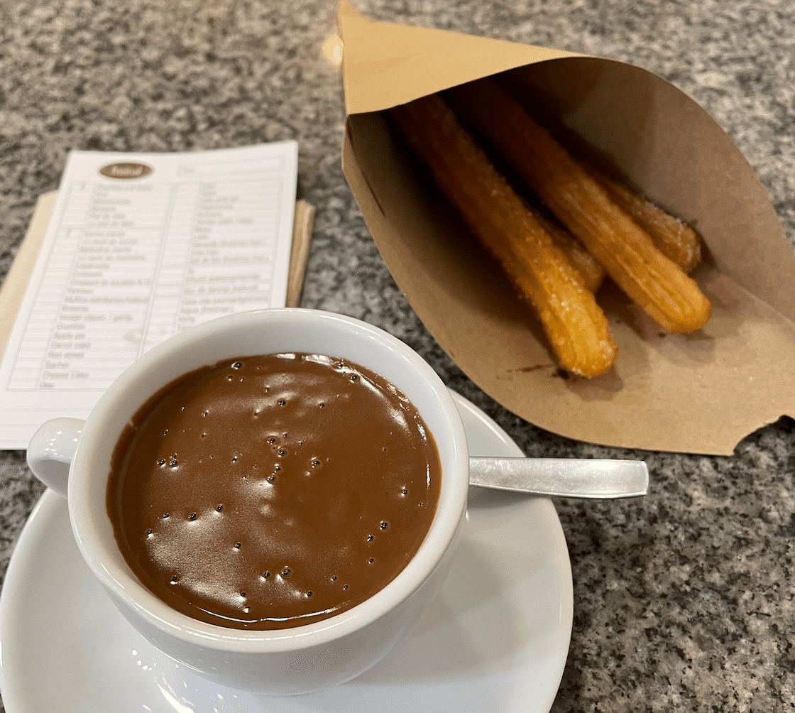 マドリードで食べたチュロスと違って、チュロス自体に砂糖がまぶされている。チョコレートも若干甘い。
